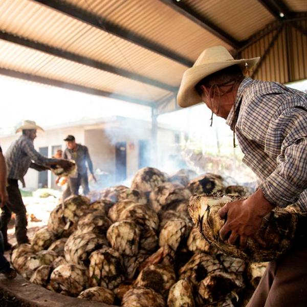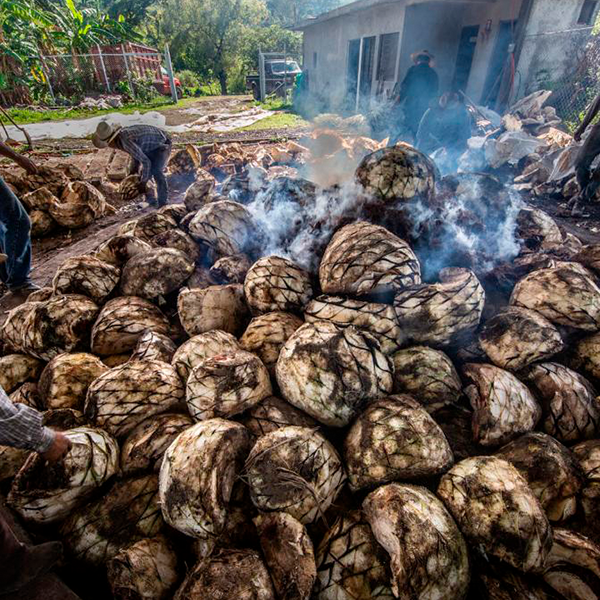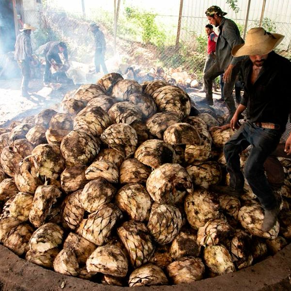 Los tallos o piñas del agave se cuecen para romper las cadenas de fructanos y obtener azucares fermentables. Esta fase se realiza en hornos da nivel del suelo revestidos de piedra.